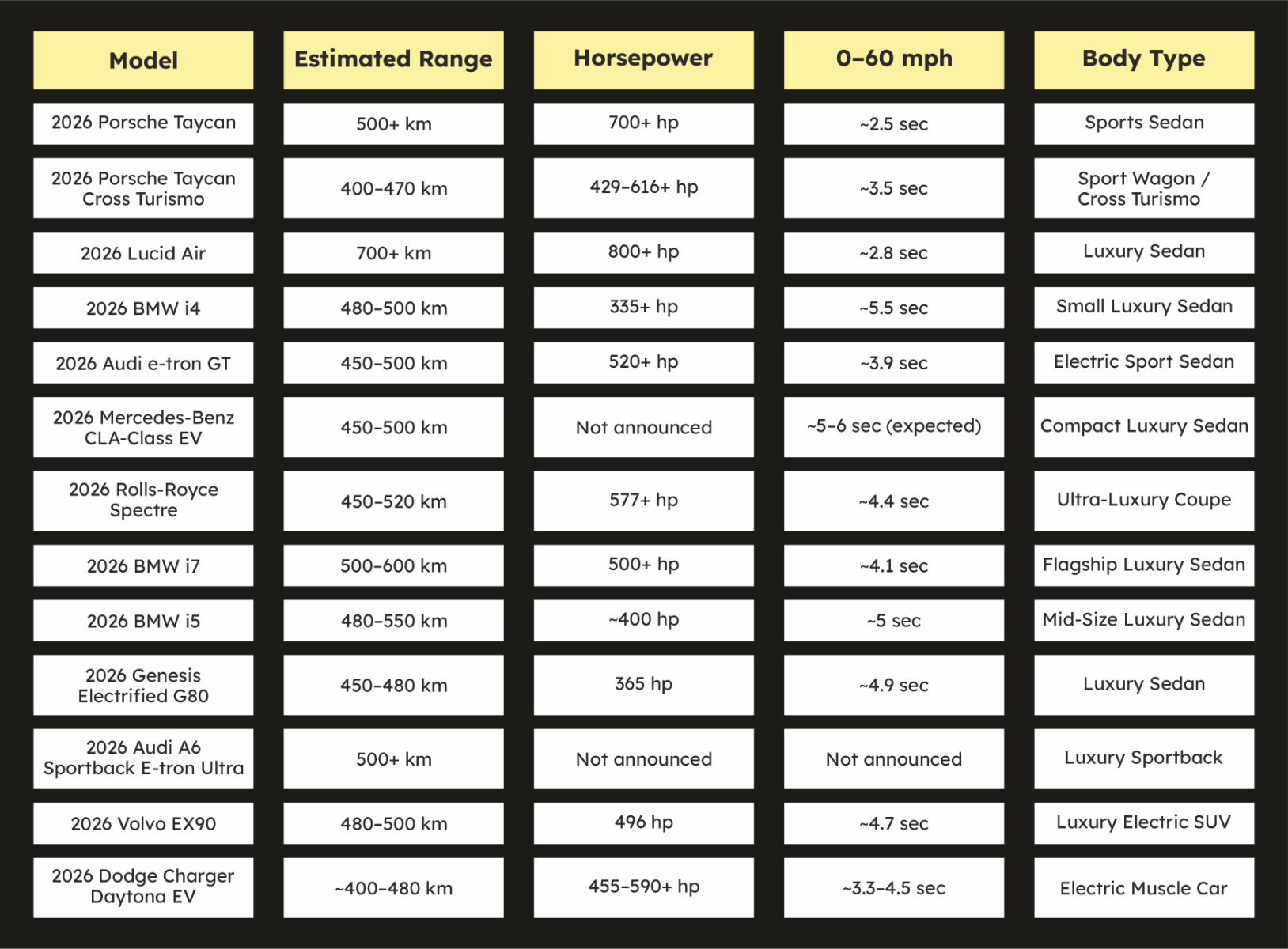 Here’s a simple comparison of some of the top luxury EVs coming in 2025–2026.