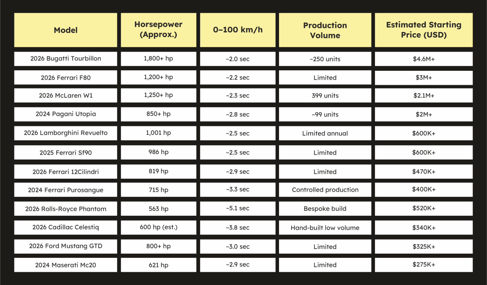 Before exploring each model in detail, here is a quick comparison of horsepower, acceleration and production volume among the top-tier 2026 models.